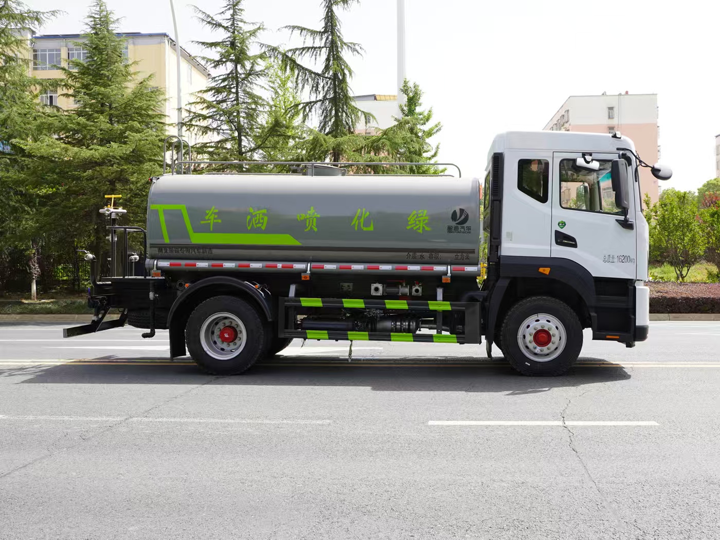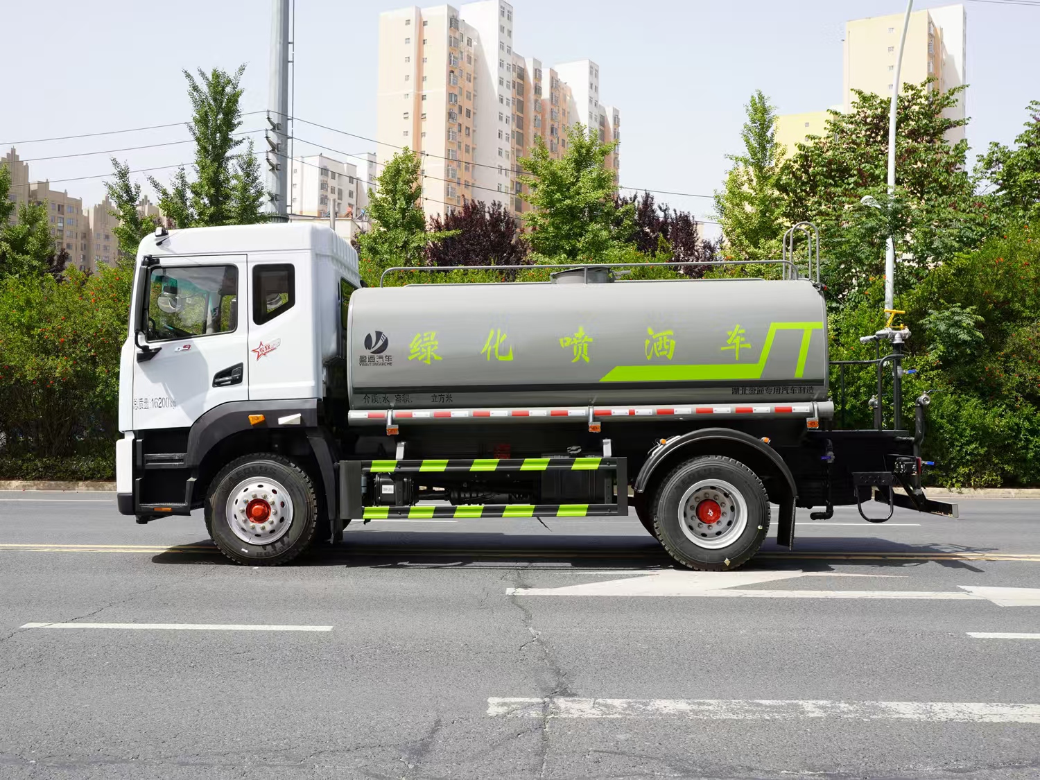 改裝配置:罐體用4MM碳鋼板製作,罐內隔板具有防波作用,以減低汽車行駛時罐體液體的衝擊。整車帶一個專用灑水泵(垂直最大吸程6米),灑水寬度14米,射程28米。多功能灑水車配備2個前衝(噴)(能將路麵泥巴、塵土、垃圾衝幹淨);2個後灑(能均勻地將水灑在路麵,一次灑水寬度14米)、2個側噴(花灑)(能均勻地將路旁綠化帶澆灌)、帶1個後工作平台,平台上安裝1個綠化灑水高炮(灑水炮可全方位旋轉,可連續調成直衝狀、大雨、小雨、毛毛雨,霧狀可調節衝洗高大樹木),引水時間<5min,流量90m3/h。帶1個消防接頭,帶1個自流閥,1個過濾裝置、人性化爬梯及側防護欄,安裝灑水音樂喇叭。