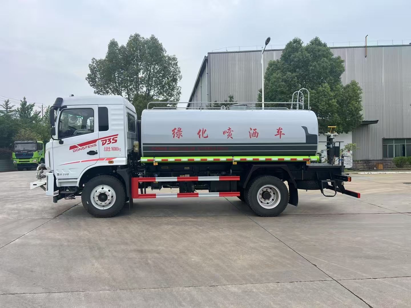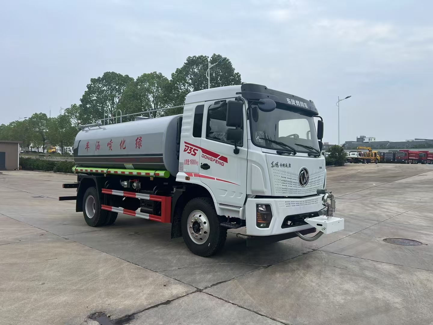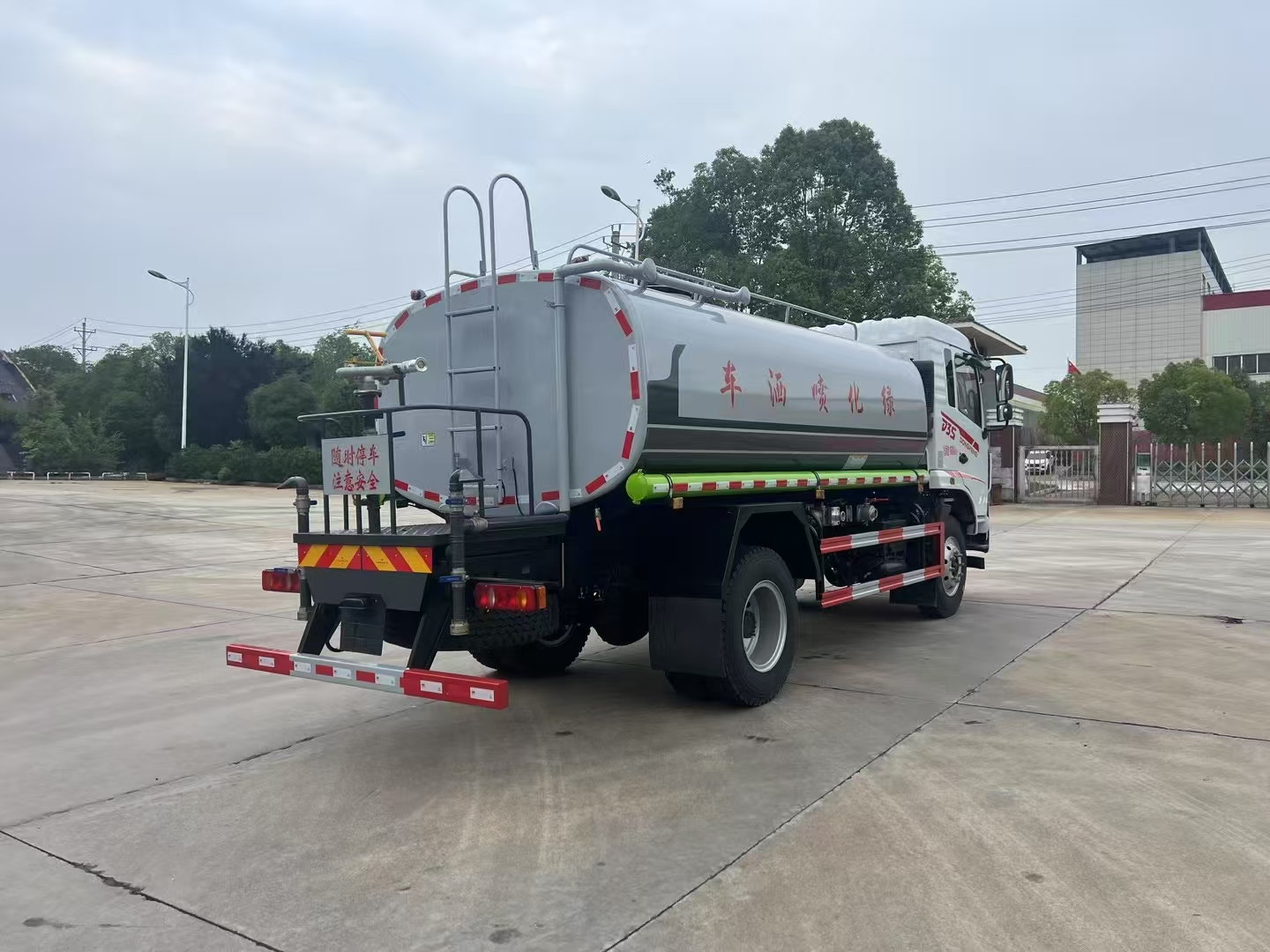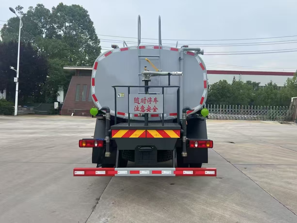 改裝配置:罐體用4MM碳鋼板製作,罐內隔板具有防波作用,以減低汽車行駛時罐體液體的衝擊。整車帶一個專用灑水泵(垂直最大吸程6米),灑水寬度14米,射程28米。多功能灑水車配備2個前衝(噴)(能將路麵泥巴、塵土、垃圾衝幹淨);2個後灑(能均勻地將水灑在路麵,一次灑水寬度14米)、2個側噴(花灑)(能均勻地將路旁綠化帶澆灌)、帶1個後工作平台,平台上安裝1個綠化灑水高炮(灑水炮可全方位旋轉,可連續調成直衝狀、大雨、小雨、毛毛雨,霧狀可調節衝洗高大樹木),引水時間<5min,流量90m3/h。帶1個消防接頭,帶1個自流閥,1個過濾裝置、人性化爬梯及側防護欄,安裝灑水音樂喇叭。