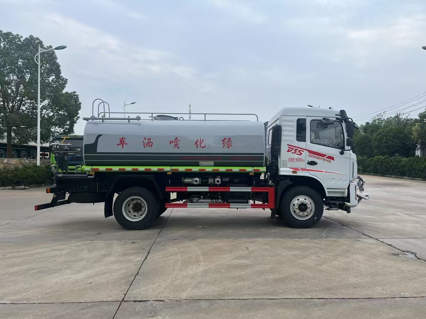 東風D3S專底12噸灑水車采用廣西玉柴180馬力,法士特8檔帶高低速變速箱,斷氣刹,帶ABS,9.00R20鋼絲胎,軸距3950mm,帶空調,整車帶免征,帶環保。采用武鋼4mmyouzhitangangbanyicijuanyachengxing,wanquanzuodaowufengchengxing。guantineisheduodaofangbogeban,caiyonggaoyaqitishiloujiance,shiguantijuyouqiangdugao,zhongxinwen,cheliangyunzaianquanpingwen。chenglisashuichechangyongyouzidonghuasashuichekaoqichejian,guantikebaozheng5年不生鏽。罐體及保險杠貼紅白色反光條,罐體兩側噴“灑水車”字樣(可按客戶指定要求噴繪字樣),罐體顏色可選擇上白下藍或銀灰銀藍。