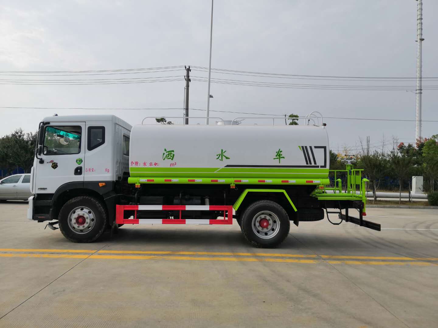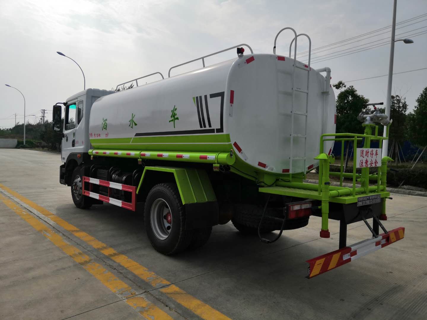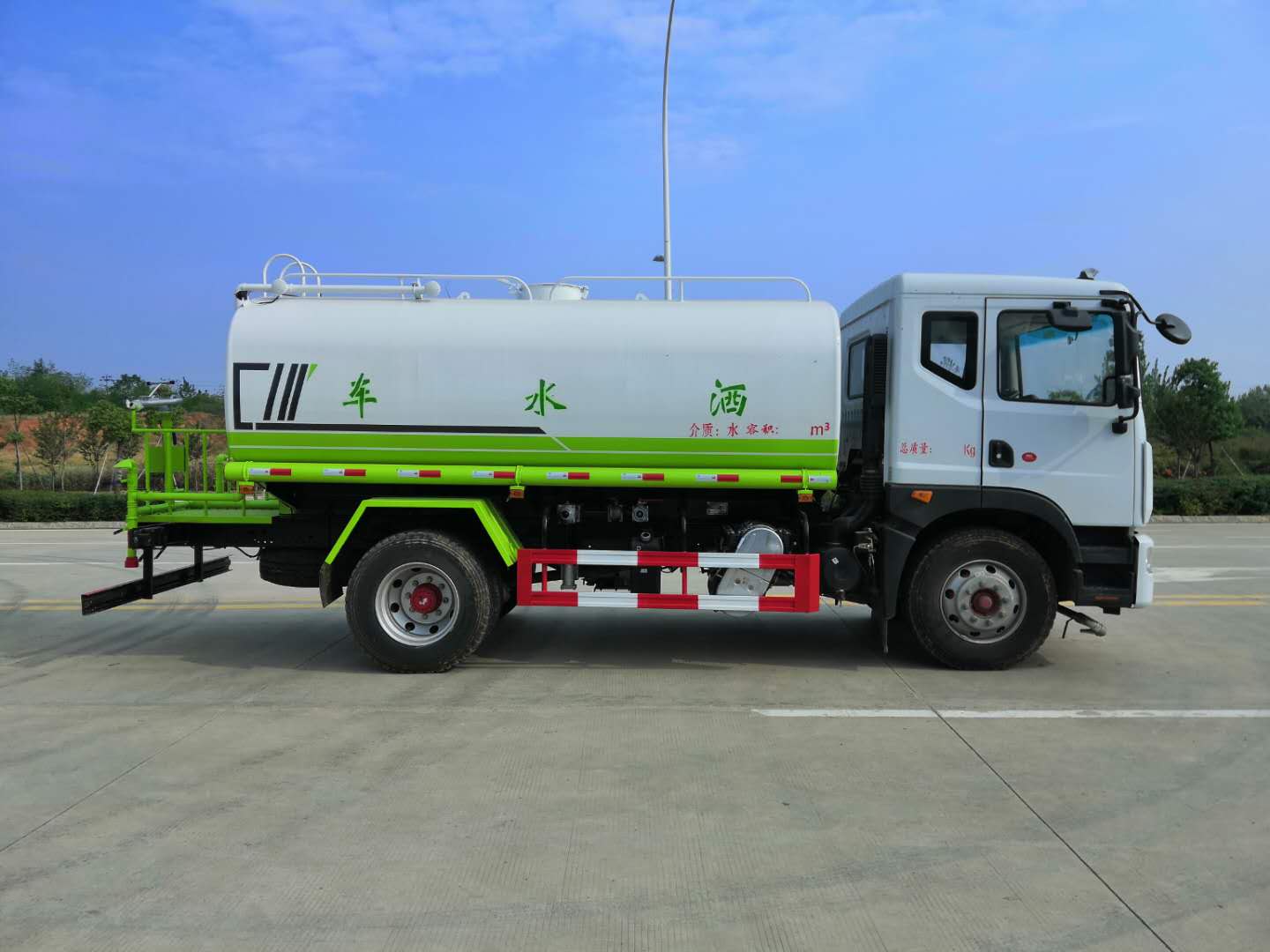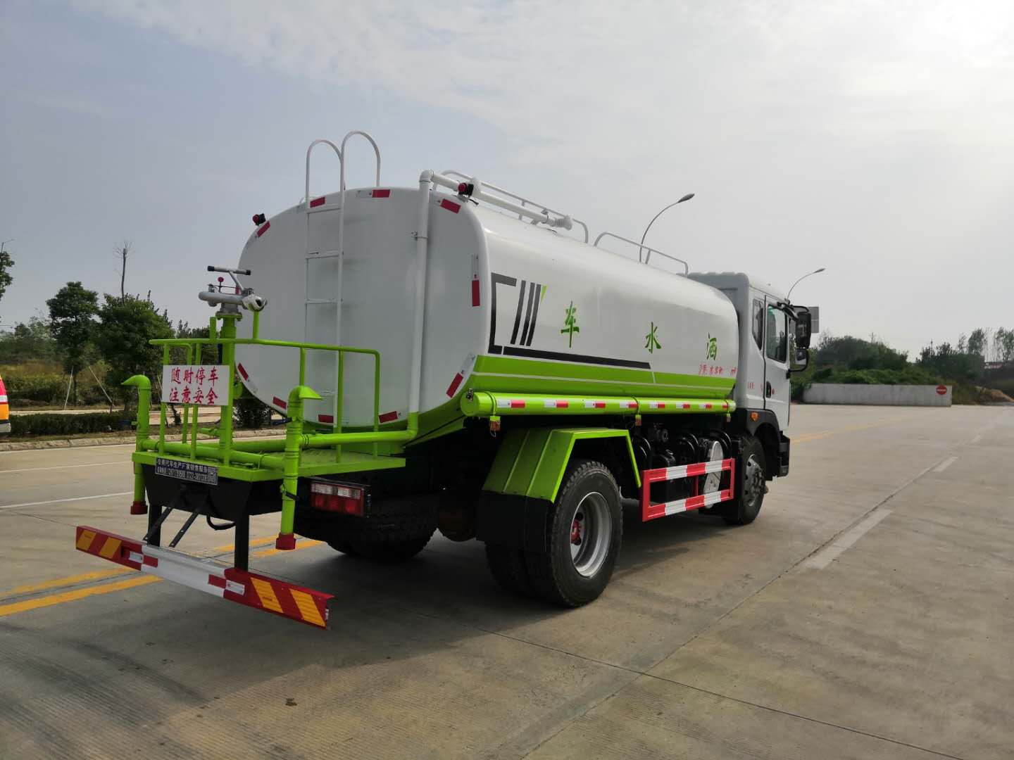改裝配置:罐體用4MM碳鋼板製作,罐內隔板具有防波作用,以減低汽車行駛時罐體液體的衝擊。整車帶一個專用灑水泵(垂直最大吸程6米),灑水寬度14米,射程28米。多功能灑水車配備2個前衝(噴)(能將路麵泥巴、塵土、垃圾衝幹淨);2個後灑(能均勻地將水灑在路麵,一次灑水寬度14米)、2個側噴(花灑)(能均勻地將路旁綠化帶澆灌)、帶1個後工作平台,平台上安裝1個綠化灑水高炮(灑水炮可全方位旋轉,可連續調成直衝狀、大雨、小雨、毛毛雨,霧狀可調節衝洗高大樹木),引水時間<5min,流量90m3/h。帶1個消防接頭,帶1個自流閥,1個過濾裝置、人性化爬梯及側防護欄,安裝灑水音樂喇叭。