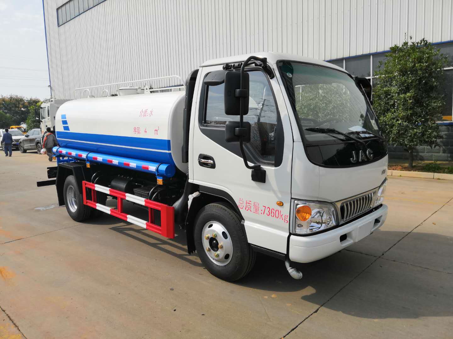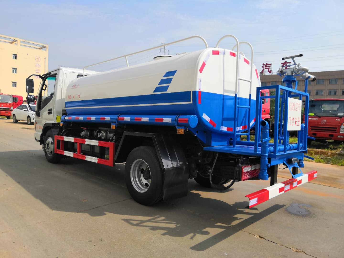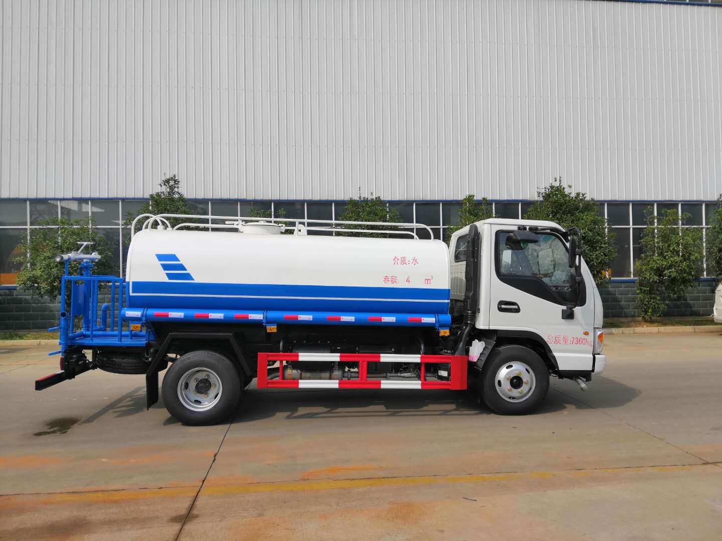改裝配置:罐體用4MM碳鋼板製作,罐內隔板具有防波作用,以減低汽車行駛時罐體液體的衝擊。整車帶一個專用灑水泵(垂直最大吸程6米),灑水寬度14米,射程28米。多功能灑水車配備2個前衝(噴)(能將路麵泥巴、塵土、垃圾衝幹淨);2個後灑(能均勻地將水灑在路麵,一次灑水寬度14米)、2個側噴(花灑)(能均勻地將路旁綠化帶澆灌)、帶1個後工作平台,平台上安裝1個綠化灑水高炮(灑水炮可全方位旋轉,可連續調成直衝狀、大雨、小雨、毛毛雨,霧狀可調節衝洗高大樹木),引水時間<5min,流量90m3/h。帶1個消防接頭,帶1個自流閥,1個過濾裝置、人性化爬梯及側防護欄,安裝灑水音樂喇叭。