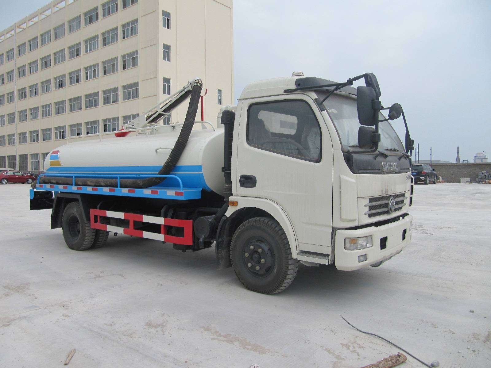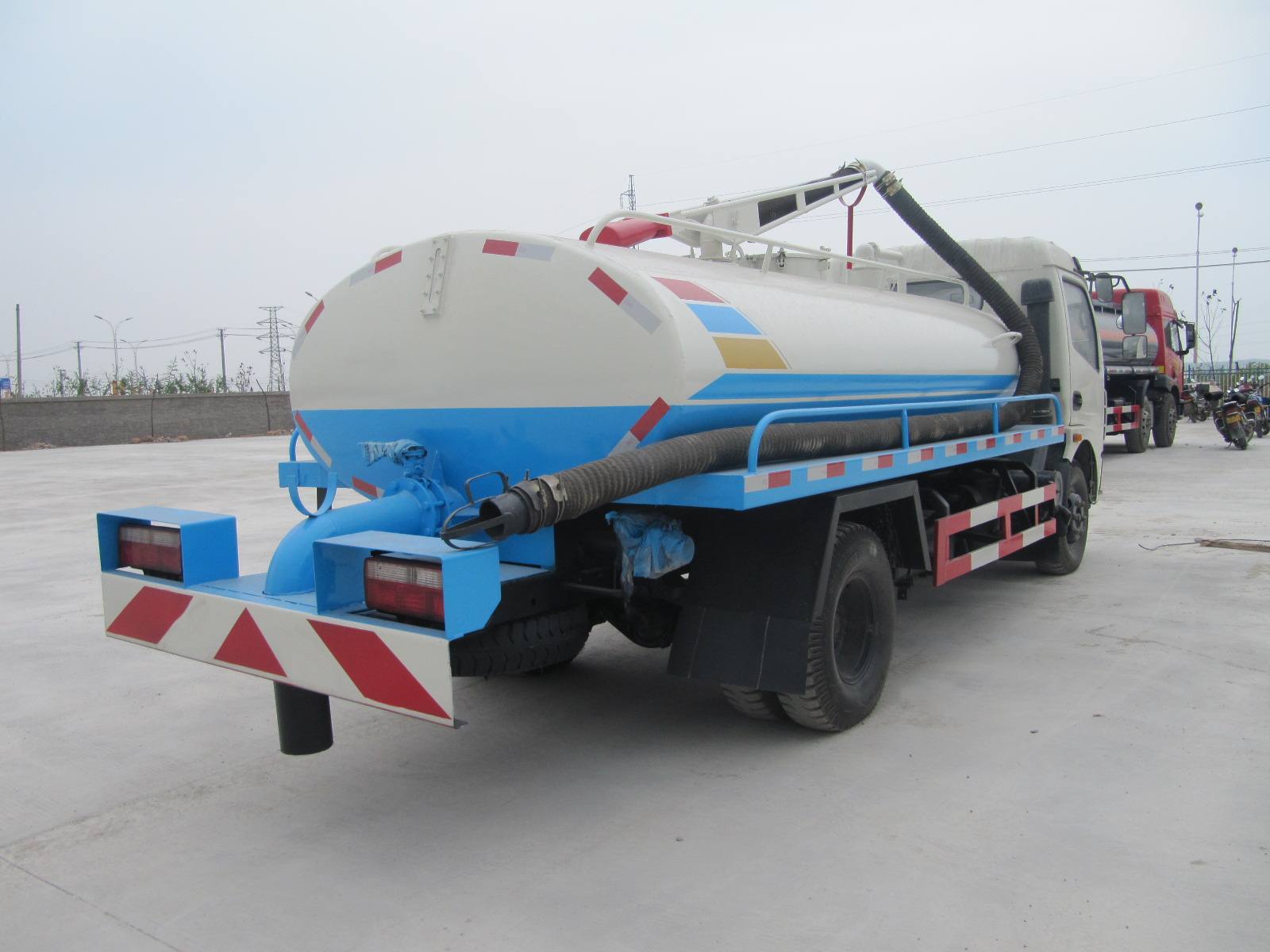 改裝配置:罐體容積9立方,罐體采用碳鋼板製作,耐用不易變形。罐體顏色上白下藍或銀灰銀藍,罐體形狀是橢圓形,配杭州威龍真空吸糞泵、可泵進泵出,抽滿汙(糞)罐體時間≤5min,垂直吸程:6m。帶視糞窗、1根6米長吸糞管,罐體後部帶有自流口1個,罐體旁邊裝有洗手裝置,罐體頂部有吸糞大架可以360°旋轉,帶吊杆及座,帶油水分離器、防溢閥(可防止糞便、汙水因吸滿倒灌至真空泵係統)。